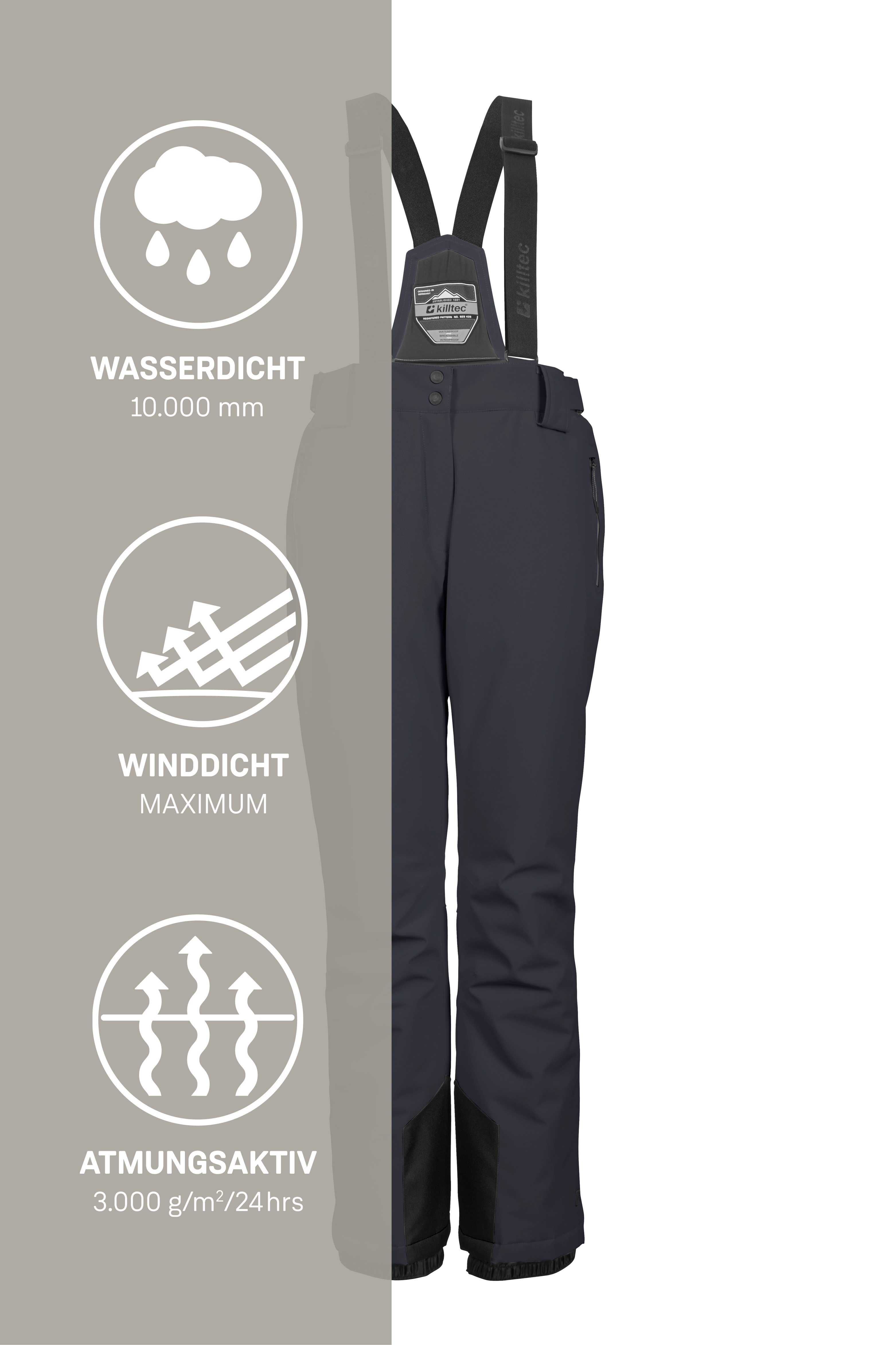 Mit der killtec Damen Skihose sind dem Wintersportvergnügen keine Grenzen gesetzt. Die Hose hat verschweißte Nähte und ist wind- und wasserdicht mit einer Wassersäule von 10.000 mm. Die Beschichtung sorgt für einen guten Ausgleich zwischen Isolation und Atmungsaktivität. Die Taillenweite lässt sich mithilfe von Klettverschlüssen regulieren und die verstellbaren Träger sind bei Bedarf abnehmbar. Schneefänge an den Hosenbeinen verhindern das Eindringen von Nässe. Zudem ist die Hose mit zwei Zippertaschen sowie einem Kantenschutz an den Beinabschlüssen ausgestattet. Die Reißverschlüsse an den Beinabschlüssen erleichtern außerdem das An- und Ausziehen. Diese Skihose wurde PFAs-frei imprägniert.